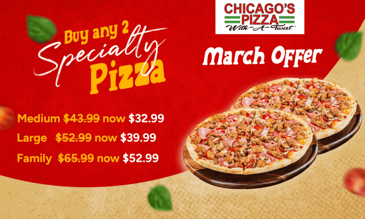 Buy 2 Medium Pizza -$43.99 Now @ $32.99, 2 Large Pizza -$52.99 Now @ $39.99 ,2 Family Pizza $65.99 Now @ $52.99