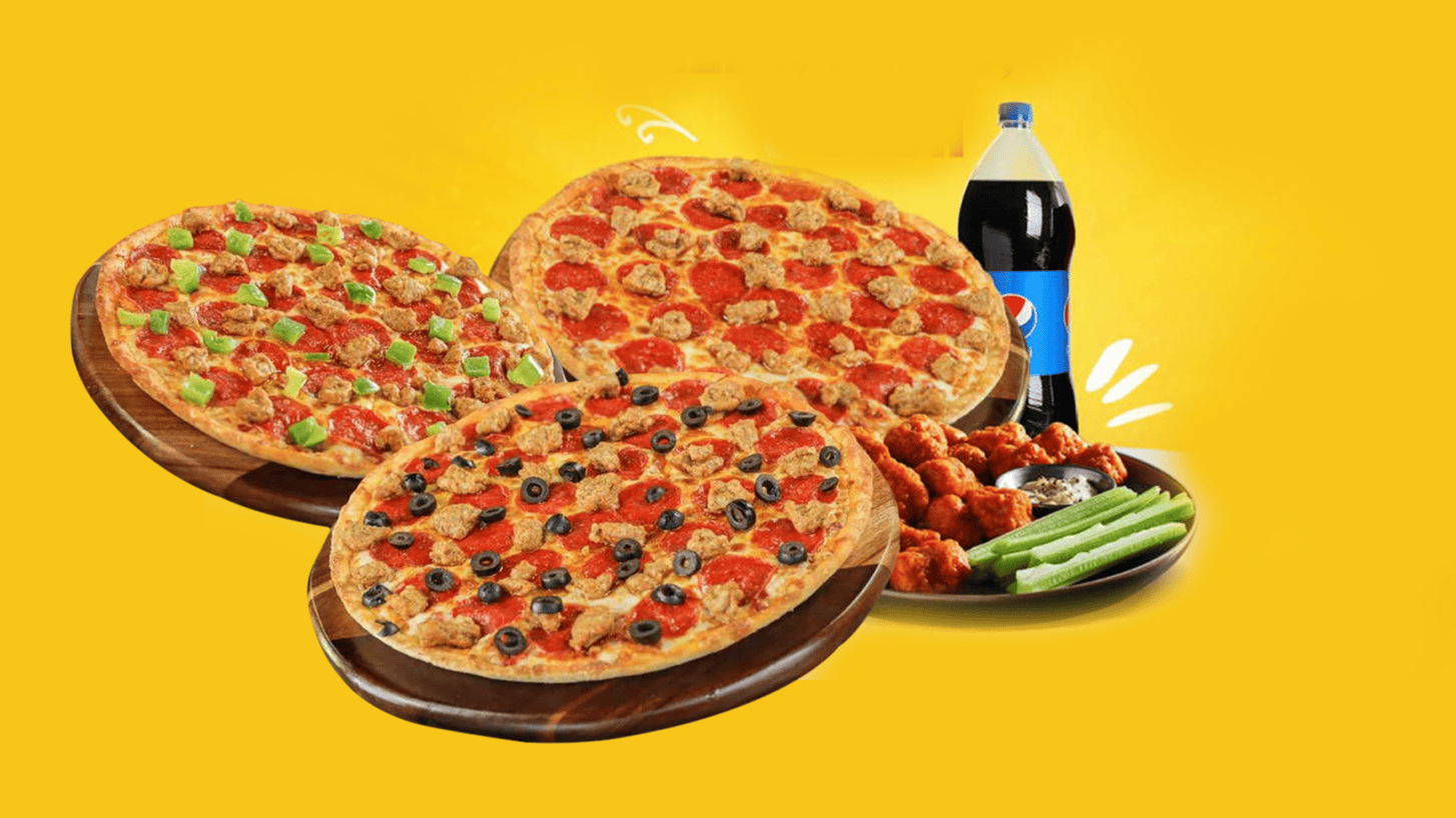 Buy 2 Family size Specialty Pizza + 1 Family size – 2 Topping Pizza + 24 Wings + 2L Soda